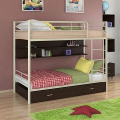 Кровать комплектуется вместительным выкатным ящиком для постельного белья или других вещей. Над нижним спальным местом располагается полка, на которой удобно разместить книги или аксессуары.