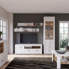 Великолепные белоснежные фасады коллекции удачно контрастируют со вставками из «ореха лион», продолговатые металлические ручки добавляют изящества, а подсветка стеклянных полок выгодно подчеркивает древесную структуру дерева.